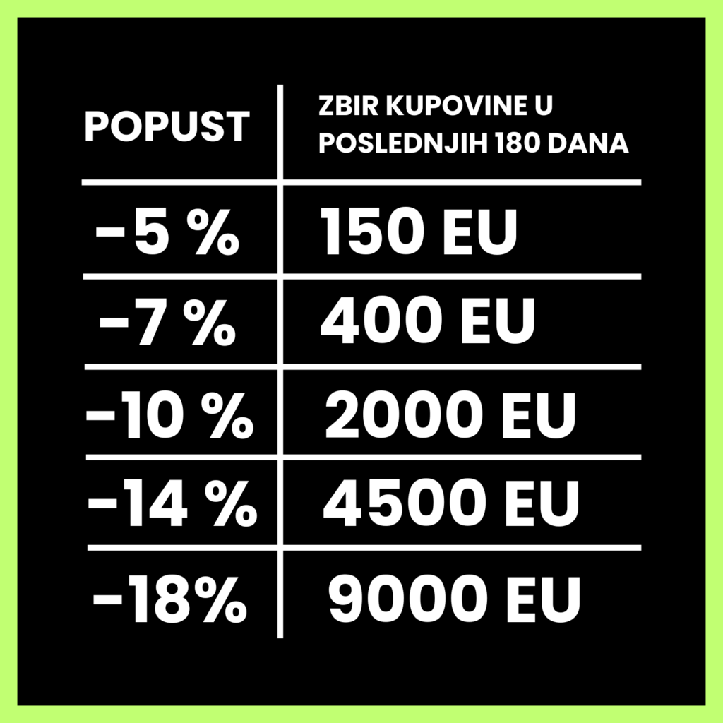 Već duže vrijeme si redovno naš kupac & uvijek smo tvoj prvi izbor? Ne voliš da se "cjenkaš", niti se pozivaš na poznanstva da bi dobio popust. Znaš i da je "spuštanje cijena" od slučaja do slučaja nezakonito, pa to i ne očekuješ od nas. Ipak, osjećaš da, kao vjerni kupac, zaslužuješ da plaćaš – neki posto manje.